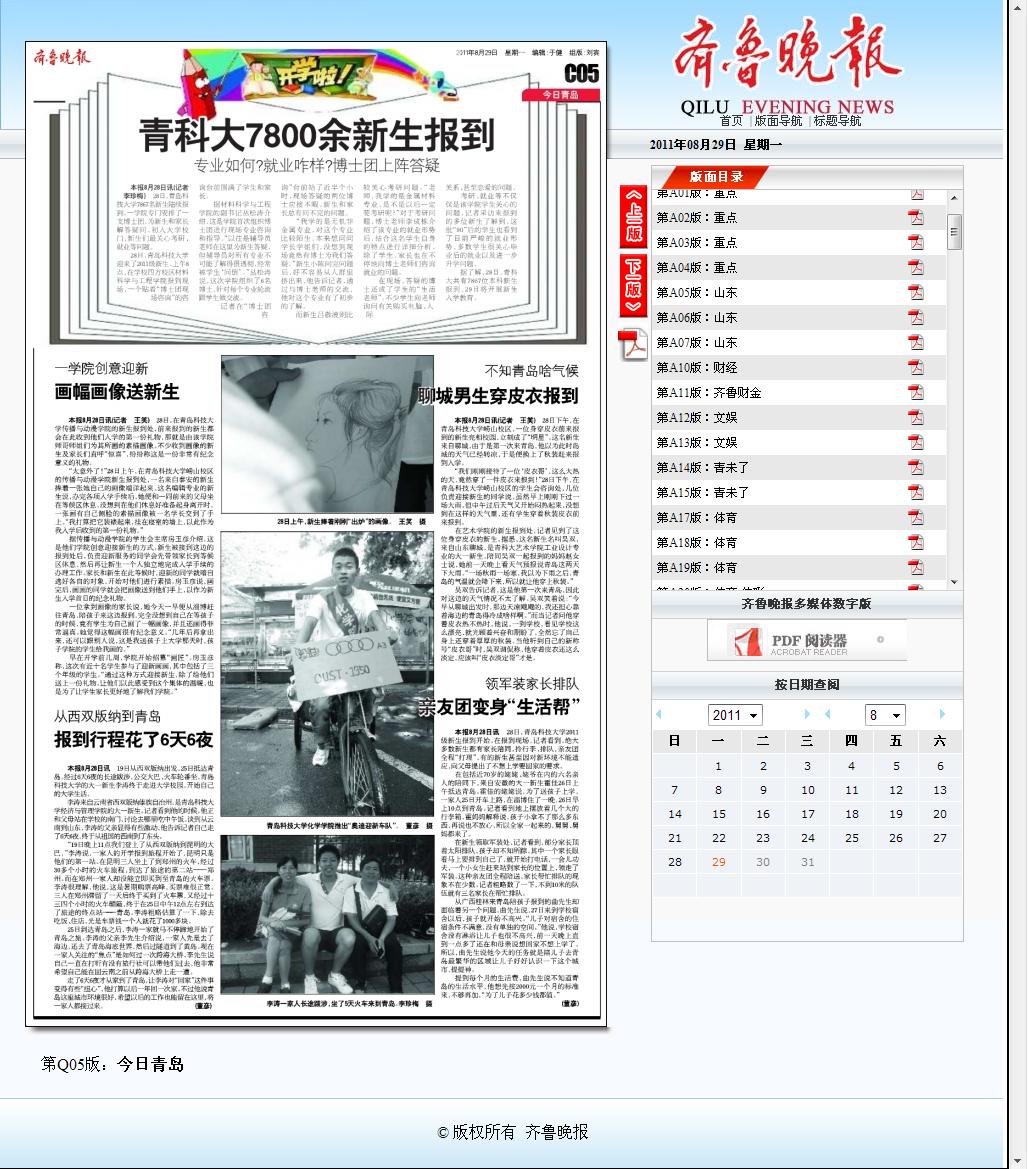 8月28日,公司2011级新生261人报到入学,8月29日《齐鲁晚报》以《画幅画像送新生》为题对公司迎新情况进行了报导。