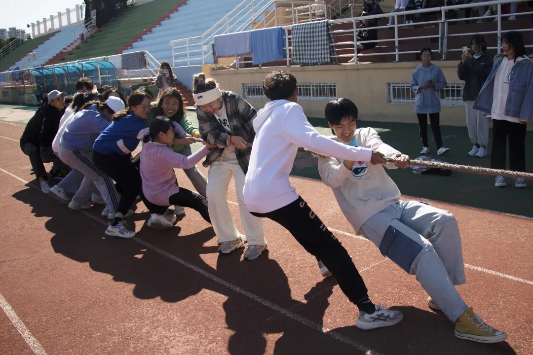 首先进行的是大一同学的比赛。大家紧握绳子,身体后仰,共同发力。经过一番激烈的角逐,动画(中英)、广告和汉学专业联队成功挺进决赛。
