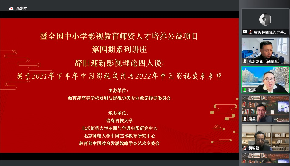 2022年1月22日下午7点-9点30,公司与教育部中国教育发展战略学会艺术专委会、中国艺术学理论学会艺术教育专业委员会、北京师范大学中国艺术教育研究中心共同承办教育部高校戏剧与影视学类专业教学指导委员会主办的审美与向善:戏剧与影视名师大讲堂”系列讲座第四季第二十讲一讲座,邀请中国电影评论学会会长饶曙光研究员、北京电影公司党委副书记胡智锋教授、中国高校影视学会会长丁亚平教授、北京大学陈旭光教授共同就“关于2021年下半年中国影视成绩与2022年中国影视发展展望”一题于云端开展精彩学术论坛。周星教授为本次学术论坛作精彩点评。张燕教授为本次论坛做全程主持,北京师范大学艺术与beat365亚洲体育官方网站任晟姝老师主持B站,快手直播,杨建华经理进行了致辞。