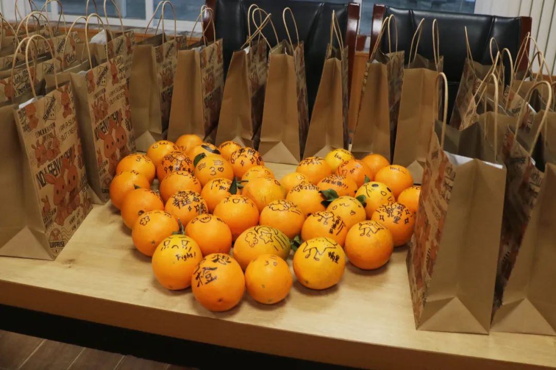 功不唐捐,玉汝于成。beat365亚洲体育官方网站团委老师和同学们亲手准备有趣又暖心的小礼物——“好运脐”,甘甜圆润的橙子被文字和图案赋予了新的含义,寓意旗开得胜,马到成功。绘制完毕,同学们设计摆出“上岸”“加油”和爱心形状,带有祝福的橙子为考研学子加油助威。除此以外,礼物袋里还有代表“你最棒”的棒棒糖和“好运旺旺”的旺旺小小酥给考生加油鼓劲。