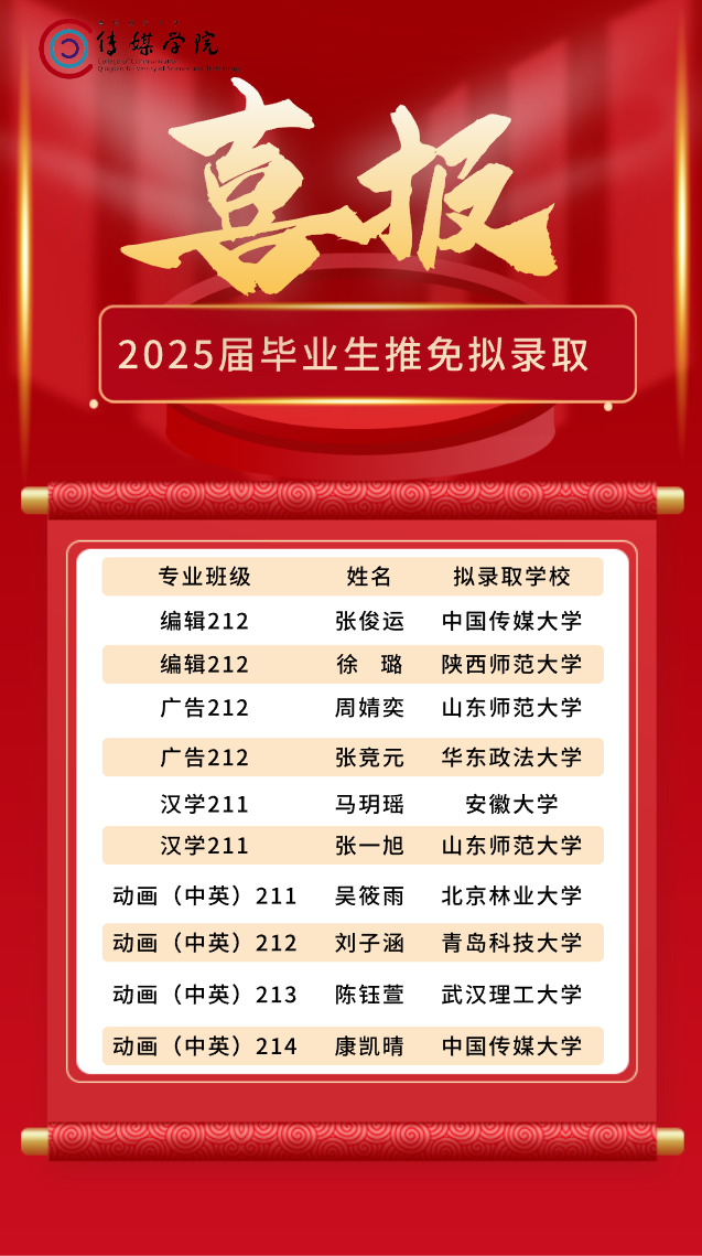 金秋送爽丰收至,佳音纷至喜气扬。近日,在全院师生的共同努力下,2025届推荐免试攻读研究生工作正式落幕,传媒学子再创佳绩,彰显优秀风采。编辑出版学、广告学、动画(中英)、汉语言文学专业获得推免资格的10名同学,均以优异的学业成绩和全面的综合素质成功推免至中国传媒大学、华东政法大学、北京林业大学等国内知名高校。