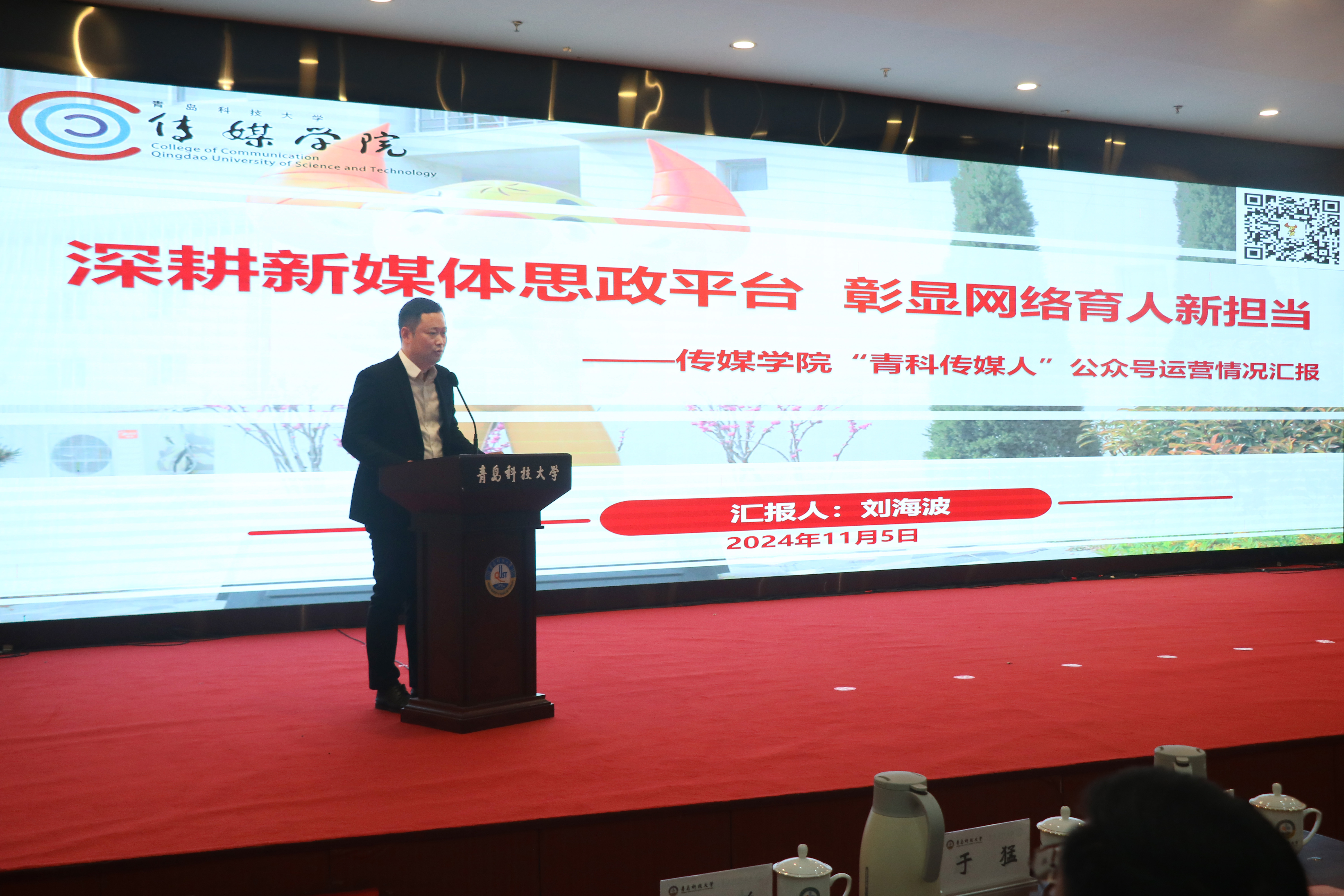 刘海波以“深耕新媒体思政平台 彰显网络育人新担当”为题,系统介绍了公司网络思政育人矩阵和媒体平台内容架构,并围绕“青科传媒人”微信公众号建设运营情况,从内容全,打造多元信息平台;队伍精,夯实思政育人基础;格局新,筑牢网络育人阵地等方面作工作交流。据悉,公司聚力打造集网站、官微、易班和抖音等平台的立体化网络思政育人矩阵,公司网站累计发布新闻1439篇,抖音阵地发布作品257篇,易班平台发布动态120条;“青科传媒人”公众号创立于2017年,现有关注者6786位,累计发文1179篇,累计阅读量120万+,着力打造集思想引领、教学科研、风采展示、信息查询等于一体的网络育人综合体。