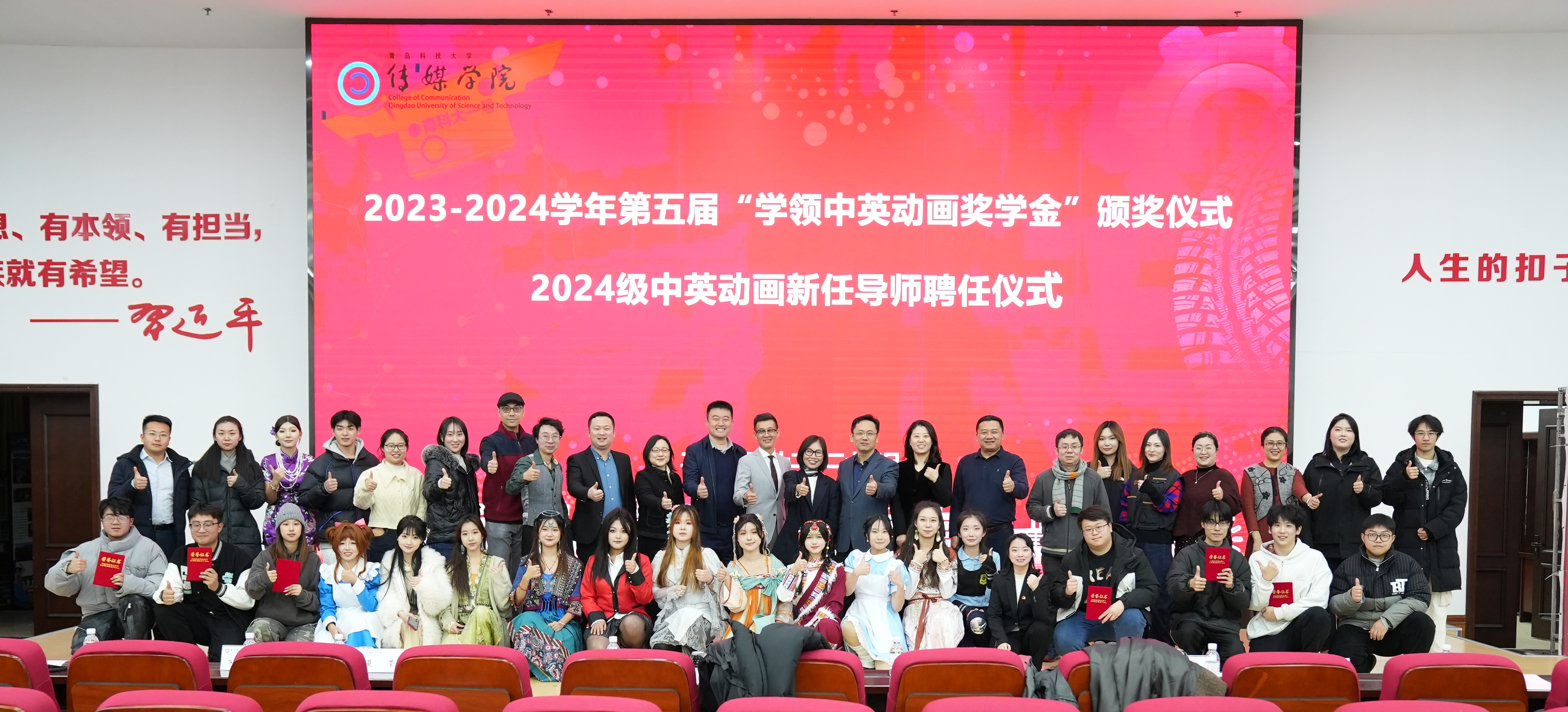 12月24日,beat365亚洲体育官方网站第五届“学领中英动画奖学金”颁奖典礼暨2024级中英动画新任导师聘任仪式在崂山校区团学报告厅举行,学领教育集团向beat365亚洲体育官方网站捐赠20万元中英动画奖学金。学领教育集团董事长唐和平、总经理夏莹,公司国际交流合作处处长陈兵,beat365亚洲体育官方网站经理张洪坤等党政领导出席典礼。影视与动画系教师杨洋主持典礼。