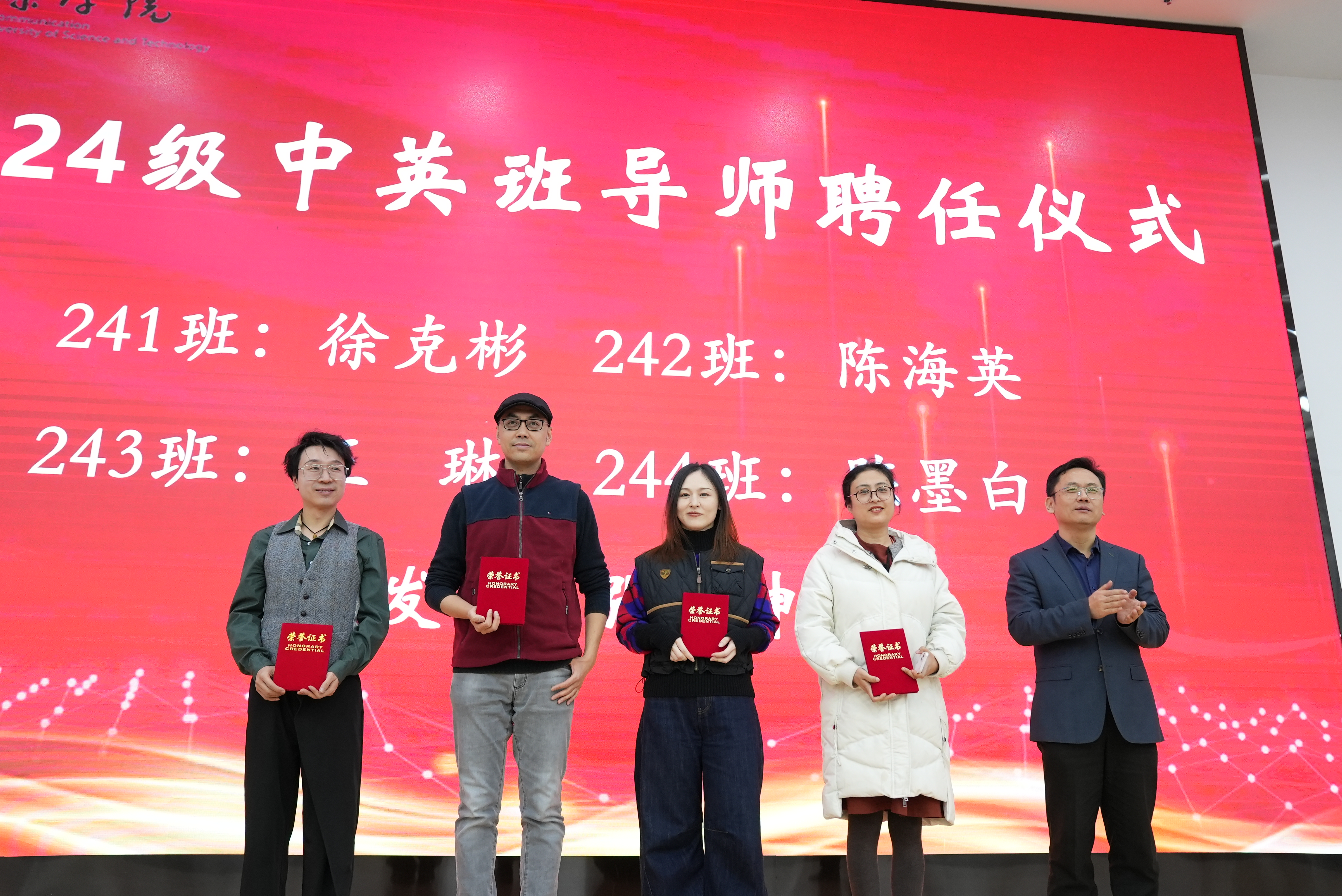 此次“学领中英动画奖学金”共颁发英语进步奖、布大创作潜力奖、优秀班级导师奖等13个奖项,旨在激励在英语、专业课学习,艺术创作等方面表现优异的员工,在员工教育管理服务中表现突出的班级导师,在就业指导上贡献卓越的教师等。典礼仪式上,中英动画班级导师代表、新老生代表分别发言,并聘任影视与动画系徐克彬、陈海英、王琳、陈墨白为2024级中英动画班导师。