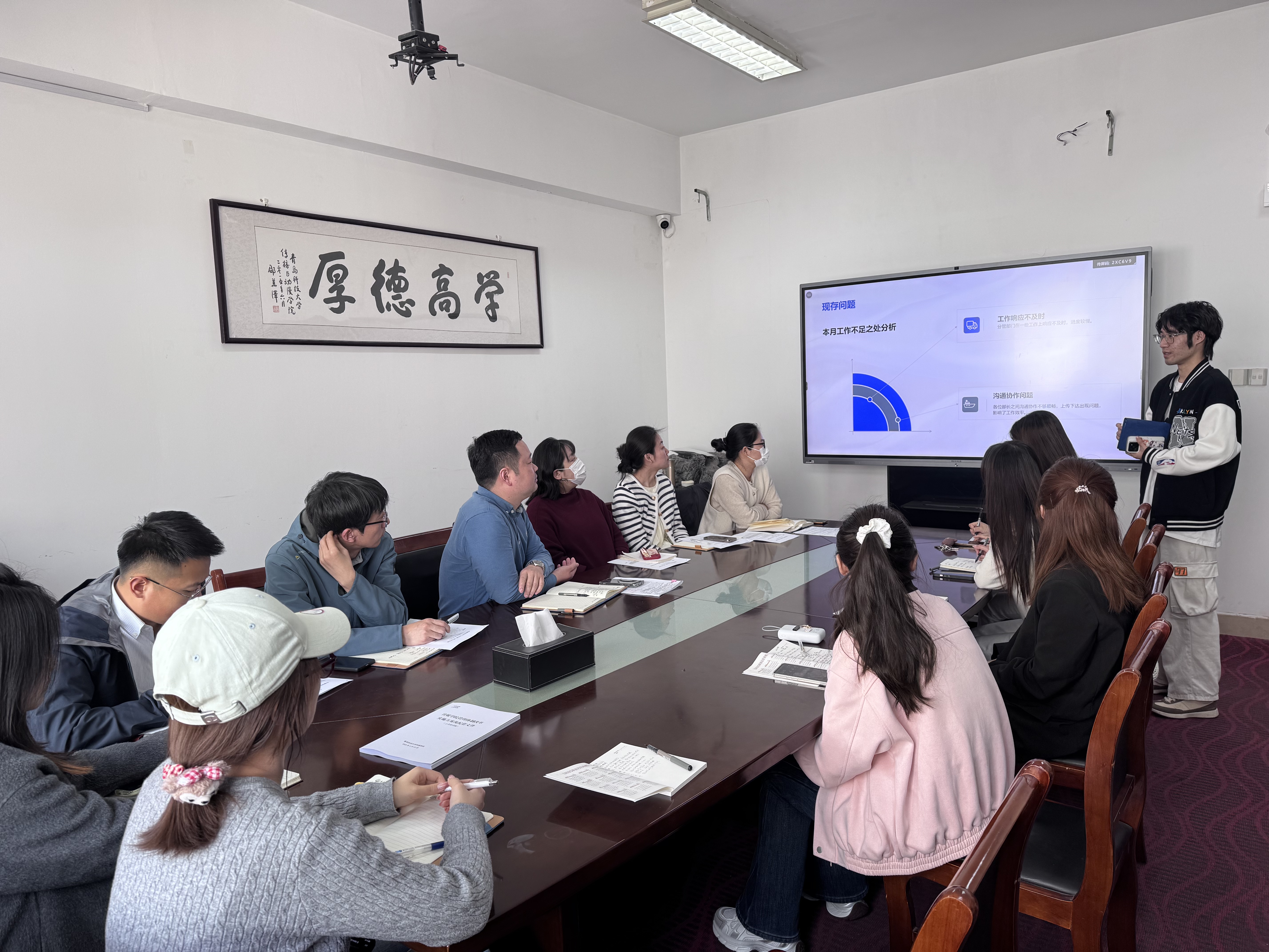 会上,各年级辅导员从党建引领、学风建设、心理健康、安全稳定、就业指导和共青团工作等方面展开,通过数据分析和案例复盘,现场提出问题,共商解决方案,形成“发现问题—共商对策—落实整改”的闭环管理机制。各员工骨干通过PPT进行汇报交流,他们聚焦岗位职责,总结经验做法,提出问题需求,在师生交流中找答案,在互学互鉴中促提升。