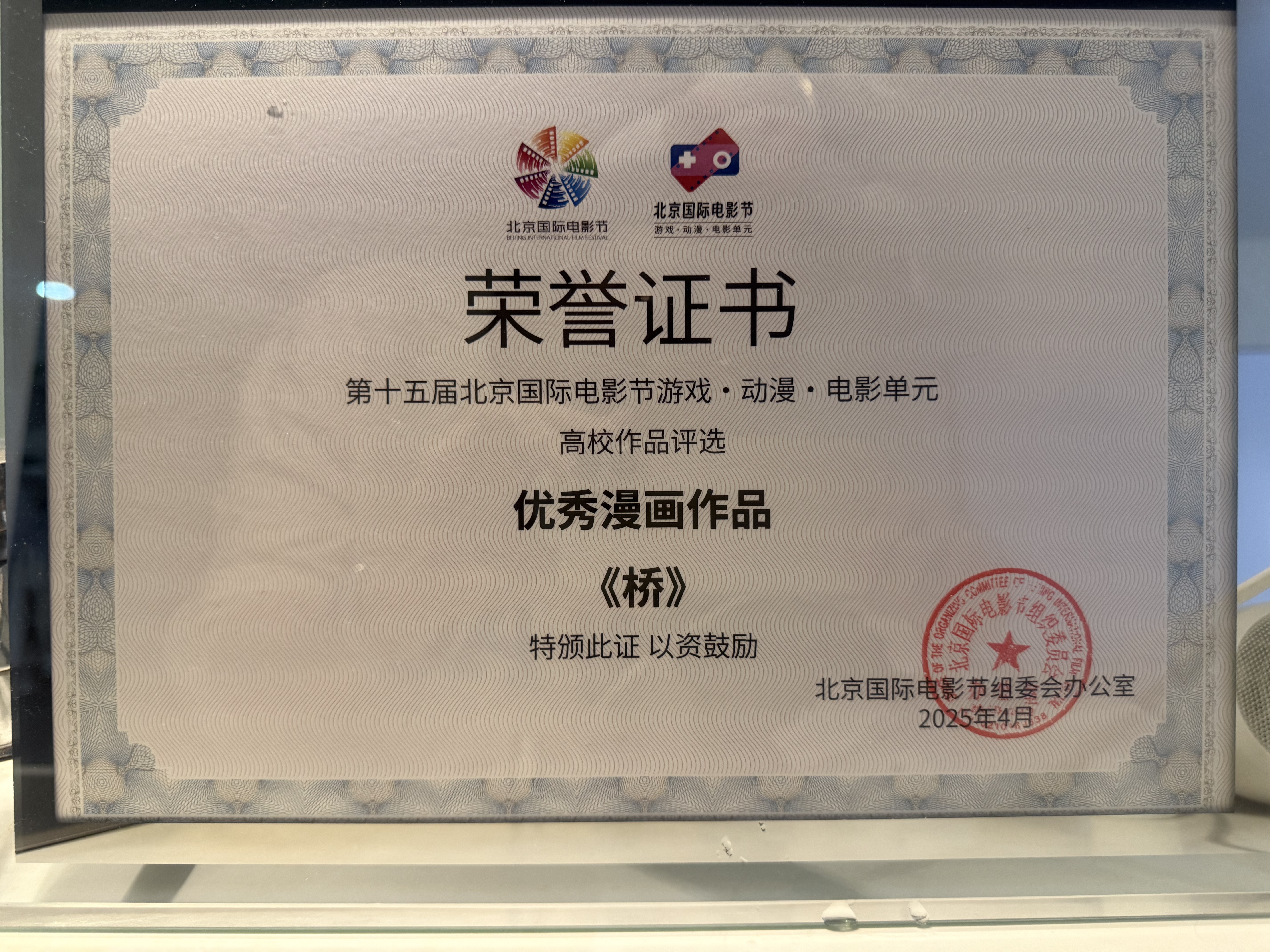 公司beat365亚洲体育官方网站于小博老师指导、谭一铭同学主笔的漫画《桥》与北京电影公司、中国传媒大学等15部作品一同,最终获得优秀漫画作品奖。