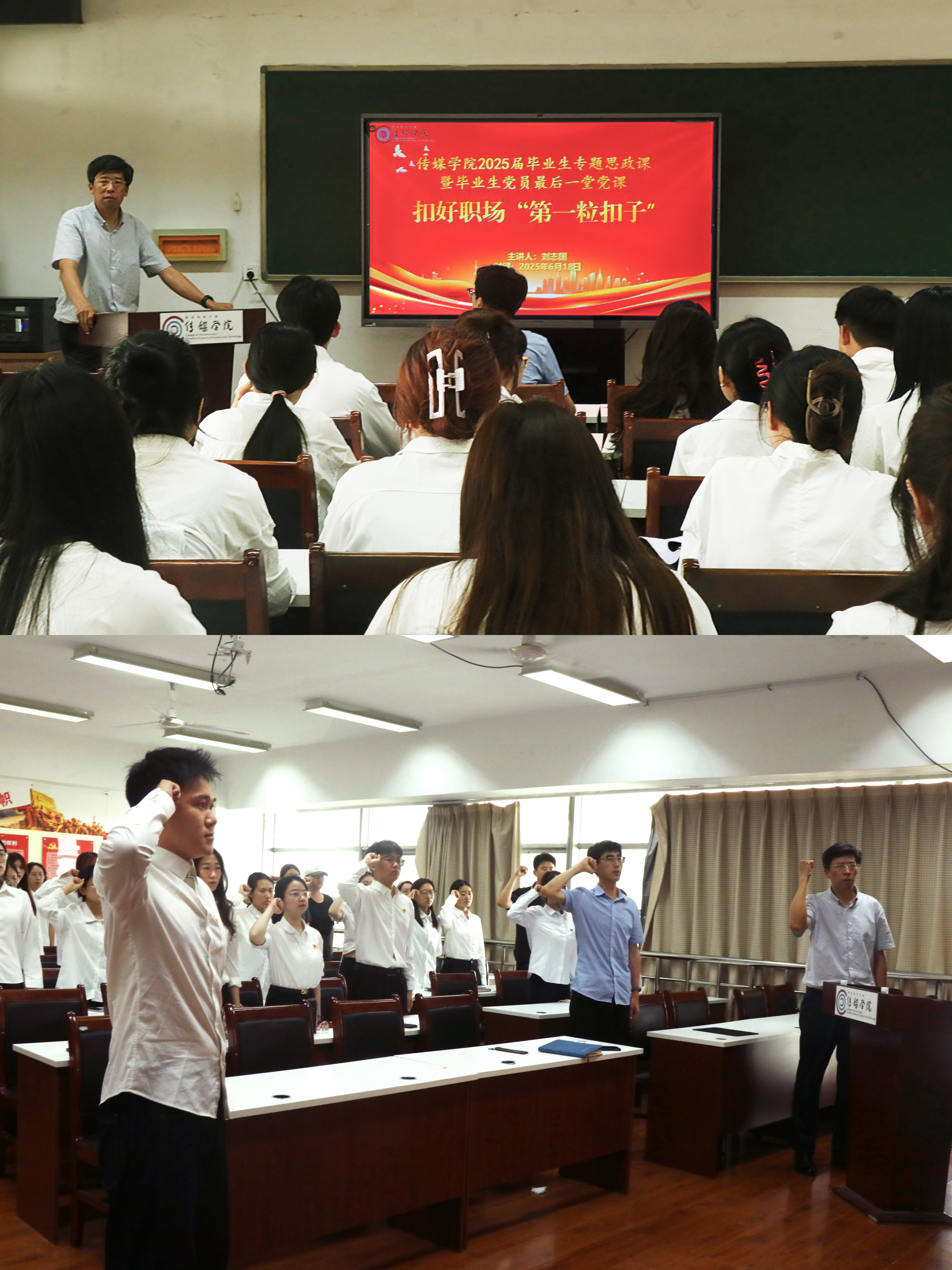 深化思政教育,强化理想信念。公司党委书记刘志国以扣好职场“第一粒扣子”为题,为2025届毕业生讲授专题思政课暨毕业生党员最后一堂党课,并带领毕业生党员重温入党誓词,签署《廉洁从业承诺书》。刘志国结合党的二十大报告中关于“党风廉政建设和反腐败斗争永远在路上”等重要论述,结合自身经历及典型案例,深刻剖析当前毕业生面临的职场廉洁风险与挑战,引导毕业生发扬“科大精神”、践行“橡胶品格”、贯彻“五有理念”,切实扣好职场“第一粒扣子”。