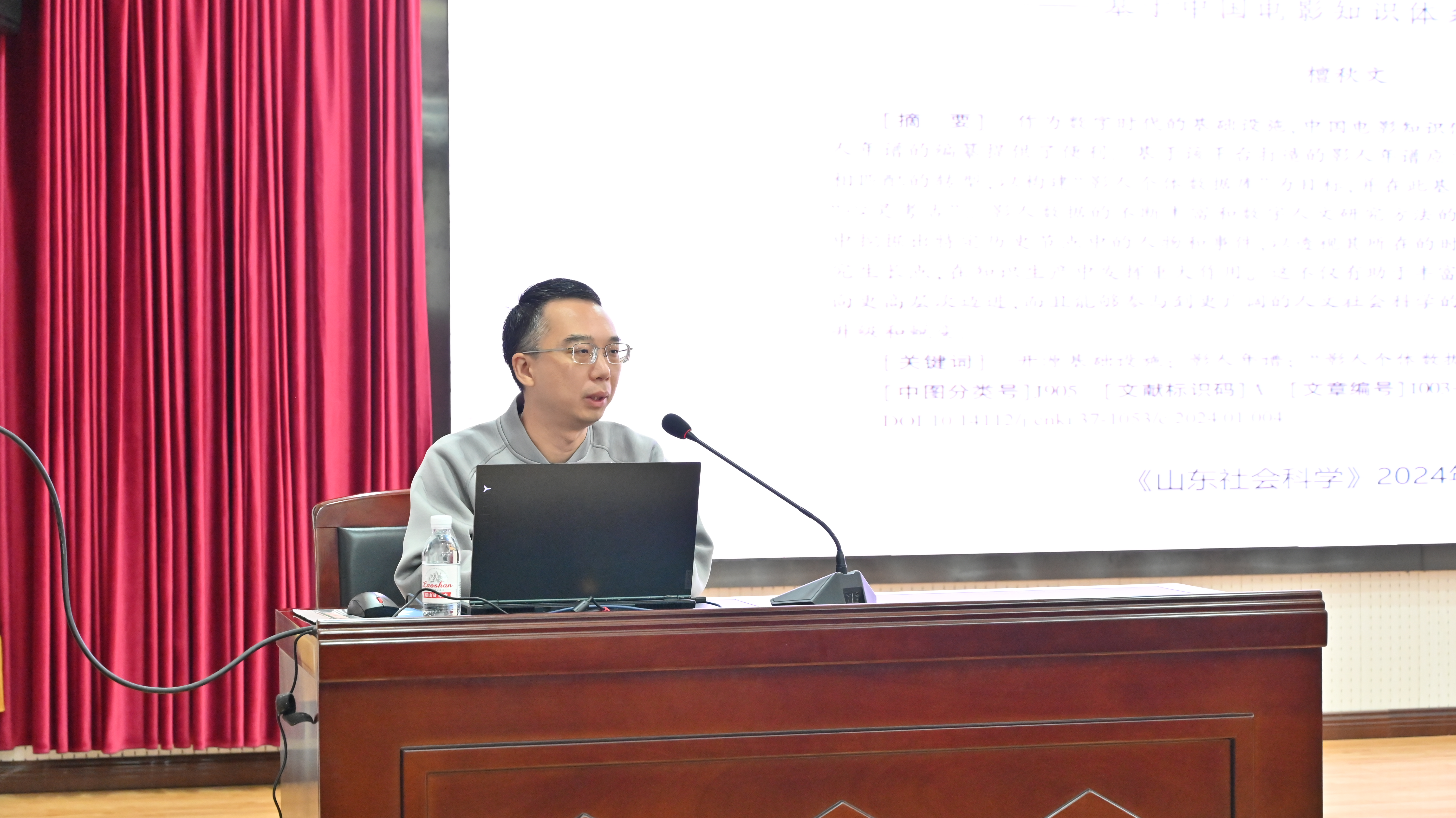之后,北京电影公司美术公司副教授薄一航以其横跨工学与艺术的独特学术背景,作了题为《人工智能思维——电影研究中的思维方式探索》的专题报告,为现场师生带来一场兼具理论深度与前沿视野的学术分享。薄一航重点介绍了计算机视觉技术在电影研究与创作中的创新应用,包括通过图像识别、场景分析等手段对影片视觉风格进行量化研究,以及为艺术创作提供数据支持的具体案例。结合自身科研与教学实践,薄一航深刻阐释了在“新文科”建设背景下跨学科人才培养的紧迫性与实施路径。