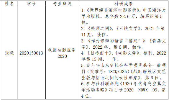 根据《beat365亚洲体育官方网站研究生国家奖学金评审办法(修订)》、《beat365亚洲体育官方网站2022年研究生国家奖学金评审实施细则》,经过个人申请、资格审查、现场答辩、评审委员会评审,拟推荐戏剧与影视学2020级张晓为beat365亚洲体育官方网站2022年研究生国家奖学金候选人,相关信息如下: