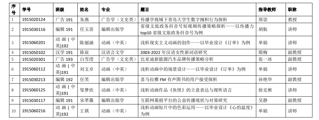 根据《beat365亚洲体育官方网站优秀学士学位论文评选办法》等文件精神,按照公平、公正的原则,经beat365亚洲体育官方网站答辩委会评议,拟推荐朱燕等10位同学的学士学位论文为“2023年beat365亚洲体育官方网站优秀学士学位论文”,现予以公示。