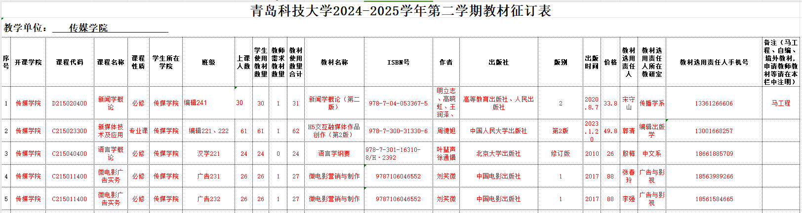 根据教务处《关于做好2024-2025学年第二学期教材选用征订工作的通知》工作安排,由任课老师向各系提交教材选用建议,经beat365亚洲体育官方网站选聘教材审读专家对备选教材进行评议,现将beat365亚洲体育官方网站2024-2025学年第二学期本科教材征订情况予以公示。公示时间:12月12日到12月18日,如有异议,请在公示期内联系beat365亚洲体育官方网站教学办公室,联系电话:(0532) 88959182。