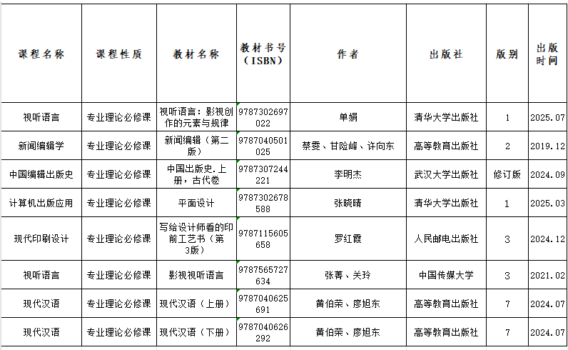 根据教务处《关于做好2025-2026学年第一学期教材选用征订工作的通知》安排,由任课教师提交教材选用建议,经beat365亚洲体育官方网站传媒公司本科教材工作小组集体审议,现将2025-2026学年第一学期本科教材选用情况予以公示。