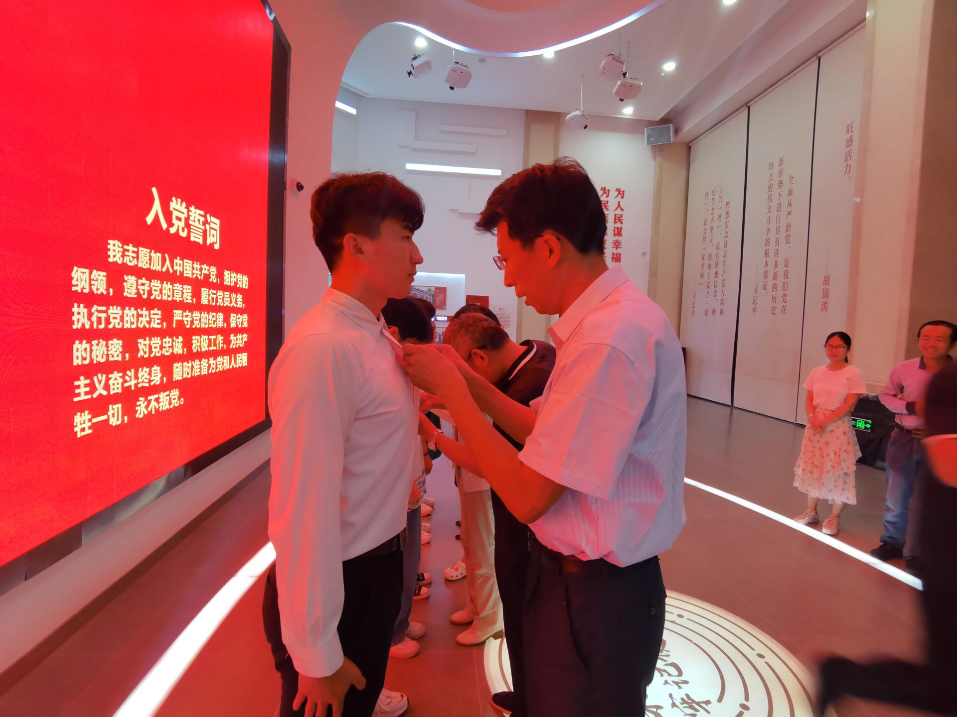 上午,公司党员师生代表来到李沧区党员政治生活馆参观学习。在展馆大厅前,公司党总支书记刘志国面向党旗,举起右手,带领大家重温入党誓词。“我志愿加入中国共产党,拥护党的纲领,遵守党的章程….,为共产主义奋斗终身,随时准备为党和人民牺牲一切,永不叛党。”大家用铮铮誓词宣示着自己的初心使命和为党的事业奋斗终身的决心。