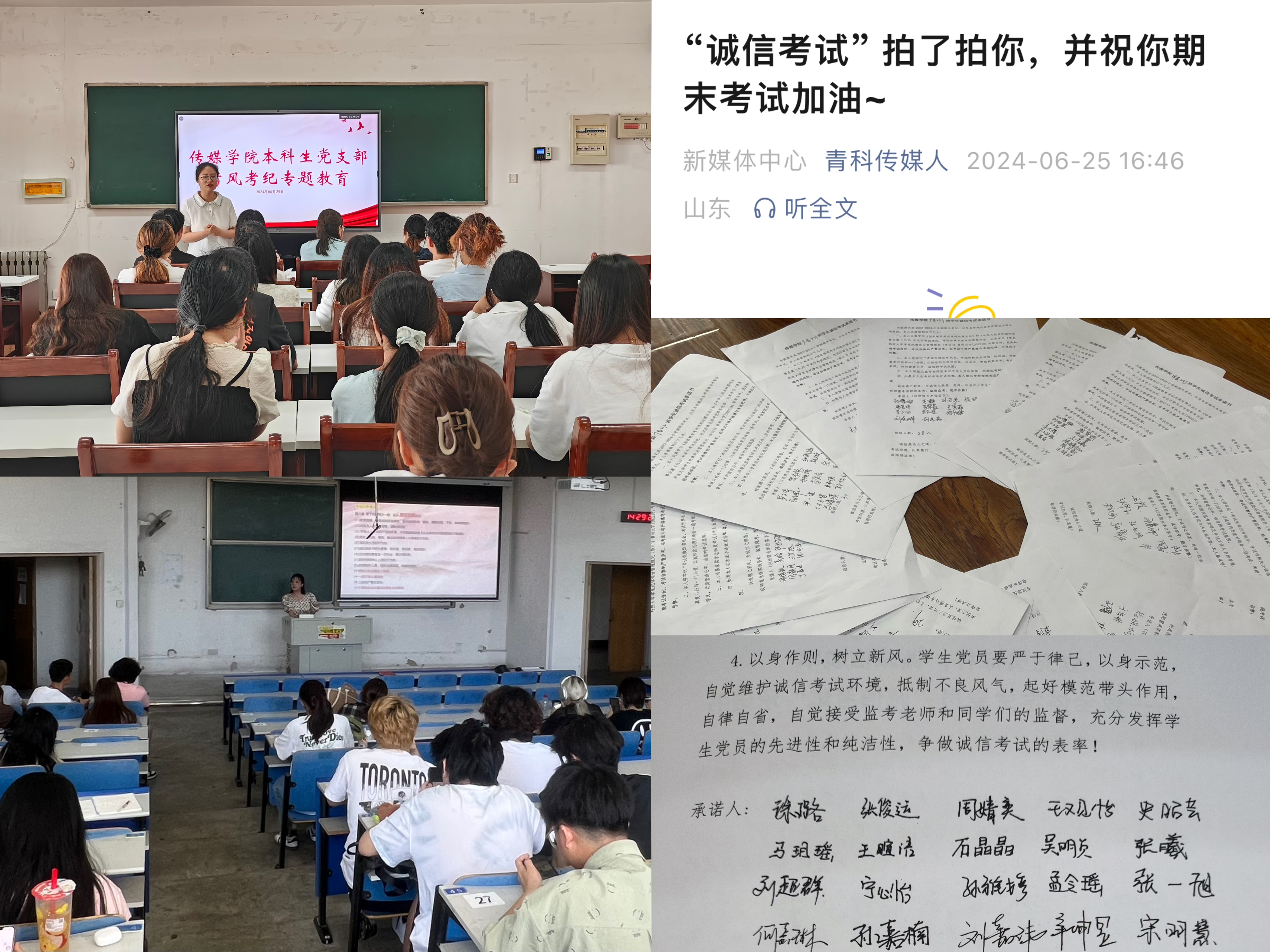抓实党员群体。6月25日,公司本科生党支部、研究生党支部书记分别开展考风考纪教育专题党课,组织全体员工党员以领学与自学的方式集中学习《beat365亚洲体育官方网站员工纪律处分管理规定(修订)》、《beat365亚洲体育官方网站员工纪律处分警示教育案例选编》等相关规定和要求,并集体签订《立党员标杆,做诚信表率--致全体员工党员诚信考试承诺书》,确保党员群体自律诚信、带头践行。抓牢全体员工。各年级辅导员以班会等形式召开考风考纪主题班会,通过对公司相关纪律处分规定的学习和考试违纪作弊案例分析,以及观看《beat365亚洲体育官方网站考风考纪警示教育宣传片》等形式,让员工们深刻认识到考试违纪的严重后果。组织宿舍党员网格员做期末考试复习技巧、期末季心理调试等内容分享,用身边人身边事激励引导员工树立考试信心。组织学子签订《诚信考试承诺书》,引导全体员工树道德之风、立诚信根基。加强网络育人。组织员工立足专业优势,绘制诚信考试“大角牛”专属表情包,并在官微发布《“诚信考试”拍了拍你,并祝你期末考试加油》原创推文,全方位营造良好的诚信考试氛围。