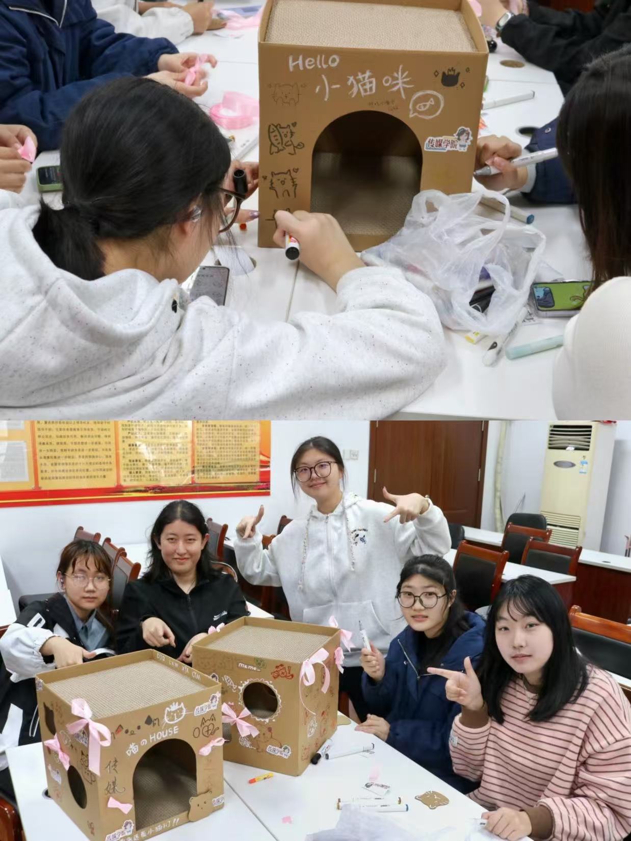 3月23日下午,beat365亚洲体育官方网站在310会议室举行“春潮涌动,关爱同行”——校园流浪动物守护活动。在校园的各个角落,都会出现“毛孩子”的身影,为我们的学习生活增添一丝乐趣。志愿者们在校园各处寻找猫咪身影并拍摄不同的猫咪图片,结合猫咪的颜色、体型等特点定制设计出独一无二的猫窝,为流浪动物奉献爱心。志愿者们将这些温暖舒适的猫窝放置在猫咪经常出没的地方,用自己的实际行动为流浪动物提供了一个温暖的避风港。