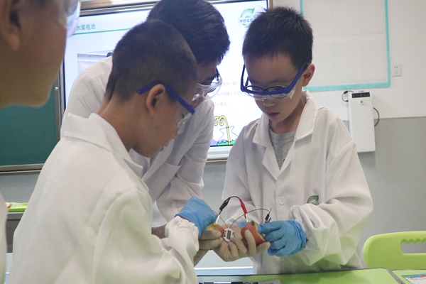 经过短暂的午休,下午三点半,小朋友们乘车来到了海信公司,参观神奇的实验室。在这里,万华的老师带领小朋友们做了三个实验:水果电池、魔法瓶子、舞动的彩虹,在此期间,志愿者和讲课老师一起帮助小朋友。小朋友们戴着护目镜、手套,认真听讲,细心操作,不仅收货了知识,还收获了快乐。