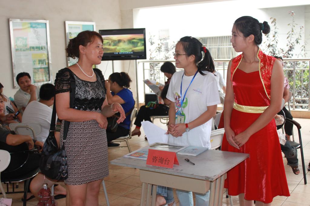 迎新现场,公司结合专业优势,在报到现场安排公司动画及广告设计专业部分员工,现场对新生或者家长进行速写。用来速写的画纸上印有公司经理寄语:“浪漫青春、锦绣前程;创意美好人生、传播中华文明”。完成后将速写送给新生,作为报到第一天的留念。结合即将到来的院庆五周年,也开展了对新生的院情教育,公司领导、各专业教研室老师在现场进行专业咨询。手印涂鸦墙组成公司院庆图案、大角牛图形等。休息区循环播放《小牛向前冲》及介绍公司的专题片。